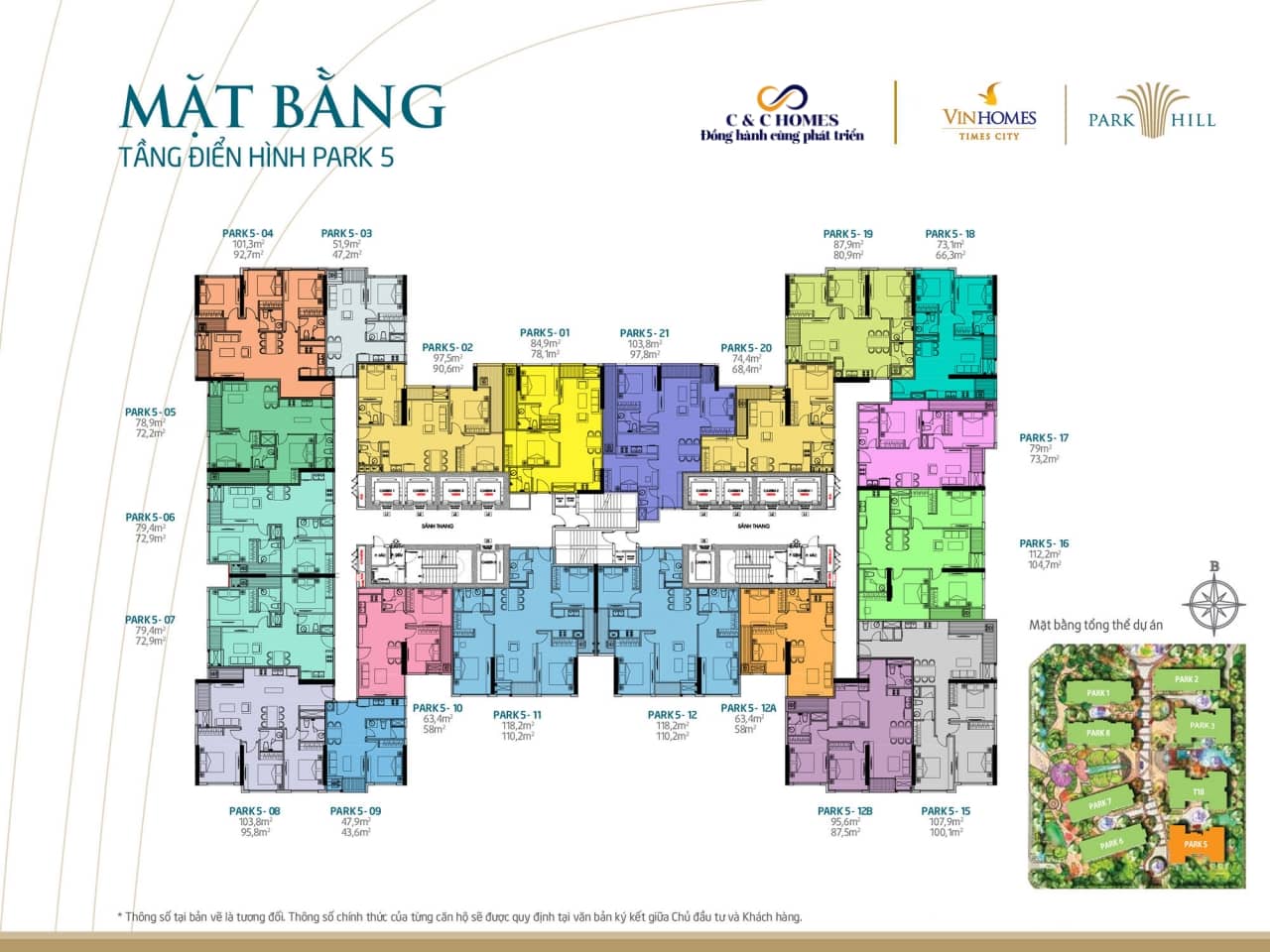 Căn hộ Park 5 Times City nằm trong khu đô thị Park Hill, phía bên tay trái của khu vực, là một trong những lựa chọn lý tưởng cho những ai đang tìm kiếm không gian sống hiện đại và tiện nghi. Với giá bán dao động từ 1.8 đến 4.6 tỷ đồng tương ứng với diện tích từ 45 đến 150 m², Park 5 đem lại nhiều sự lựa chọn phong phú cho khách hàng.