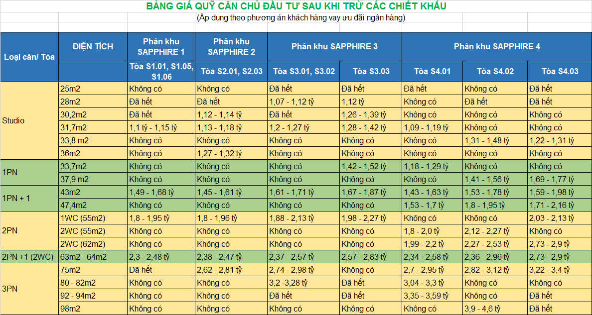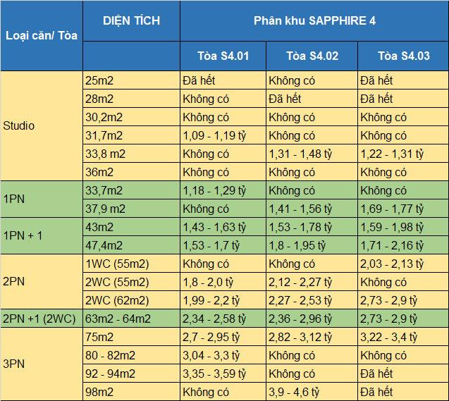 Căn hộ 1PN cơ bản có giá khoảng 1,5 tỷ đến 1,7 tỷ/căn, trong khi căn hộ 1PN+1 với không gian rộng rãi hơn lại có giá từ 1,8 tỷ. Với thiết kế hiện đại và tiện nghi, những căn hộ này rất thích hợp cho cặp vợ chồng trẻ hoặc người độc thân. Ngoài ra, nhiều căn hộ còn có thể cho thuê với mức giá hợp lý, tạo cơ hội đầu tư tốt.