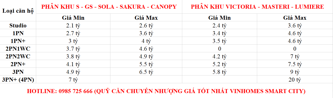 Giá Bán Vinhomes Smart City