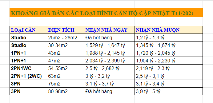 Bảng giá hiện tại chung cư Vinhomes Smart City