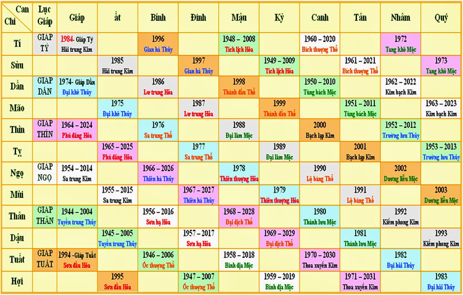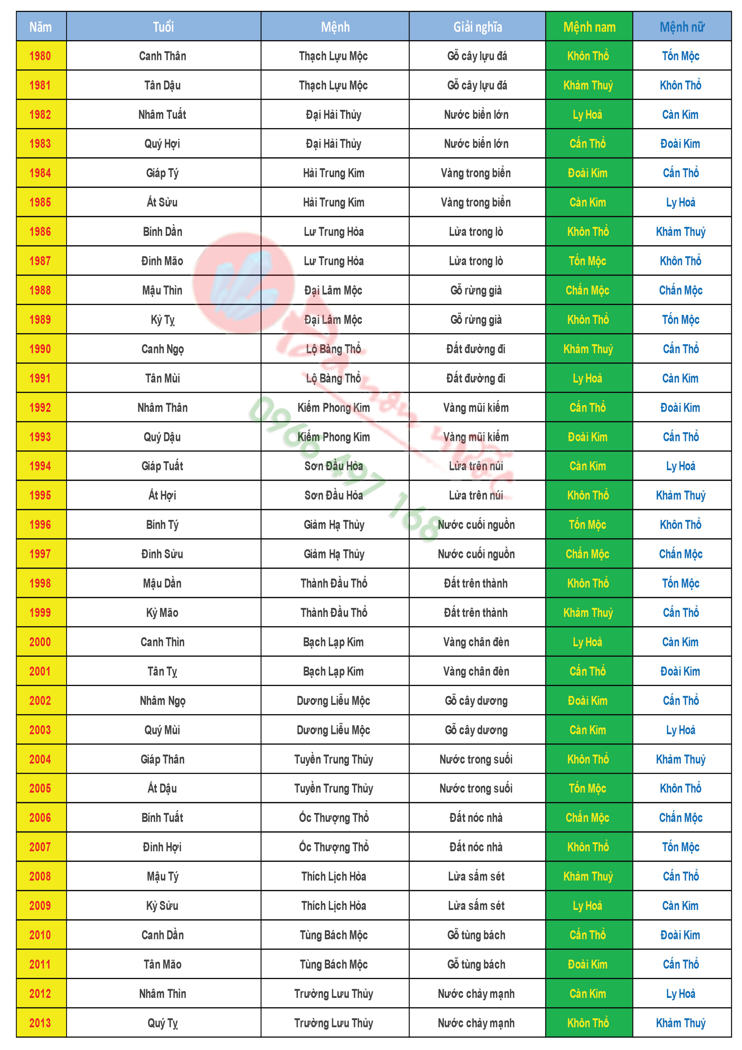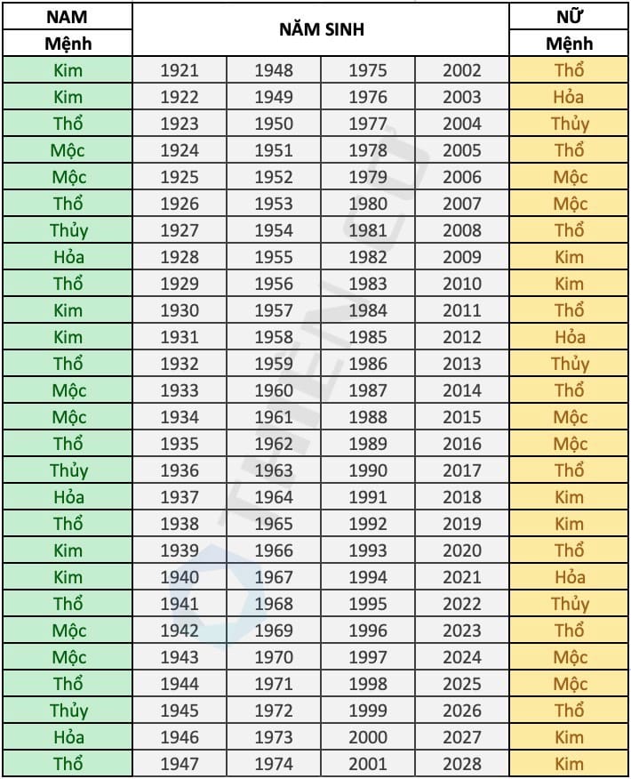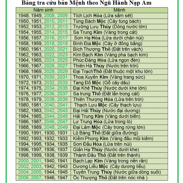 Bảng tra cứu mệnh theo năm sinh là một công cụ hữu ích giúp chúng ta xác định được bản mệnh của mình trong ngũ hành. Ngũ hành gồm năm mệnh: Kim, Mộc, Thủy, Hỏa, và Thổ, mỗi mệnh đều có những đặc trưng cũng như mối quan hệ tương sinh, tương khắc riêng. Nhìn vào bảng tra cứu, bạn có thể nhanh chóng biết được năm sinh của mình thuộc mệnh nào, từ đó ứng dụng vào đời sống và phong thủy.