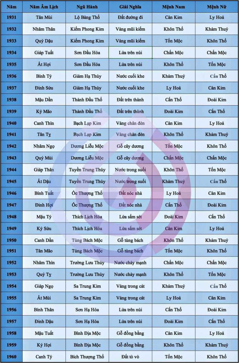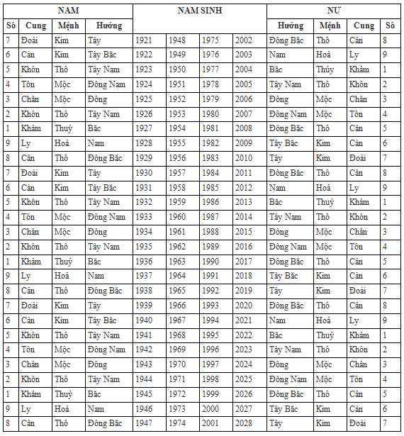 Ngoài ra, bạn còn có thể tham khảo bảng tra cứu cung mệnh cho những năm từ 1930 đến 2030, giúp bạn xác định chính xác mệnh của mình và những mối quan hệ giữa các yếu tố ngũ hành. Việc này không chỉ mang lại sự khám phá thú vị mà còn giúp bạn dễ dàng điều chỉnh cuộc sống theo hướng tích cực theo mệnh của mình.