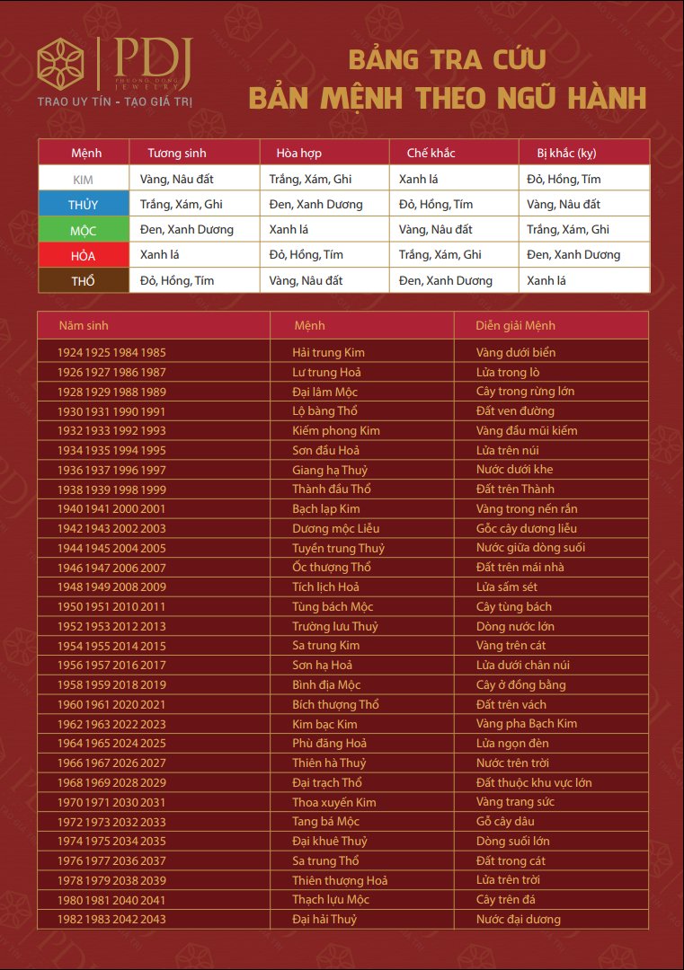 Bảng tra cứu này không chỉ thú vị mà còn mang lại nhiều thông tin bổ ích, giúp bạn hiểu hơn về bản thân và những gì tương hợp với mình trong cuộc sống. Hãy thử tra cứu ngay để khám phá thêm những điều thú vị từ mệnh ngũ hành nhé!