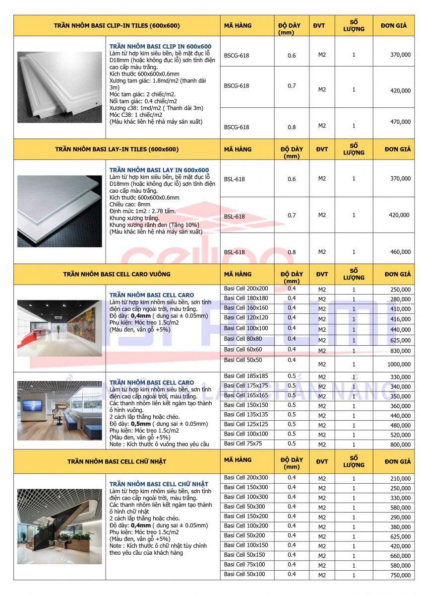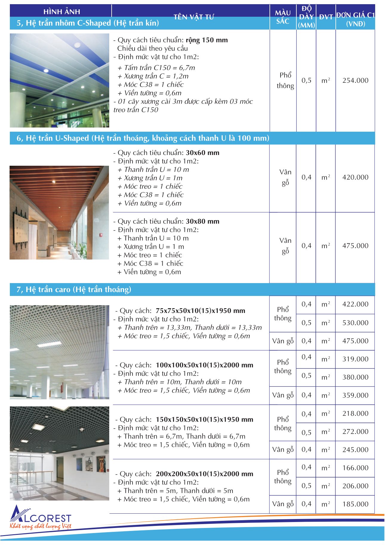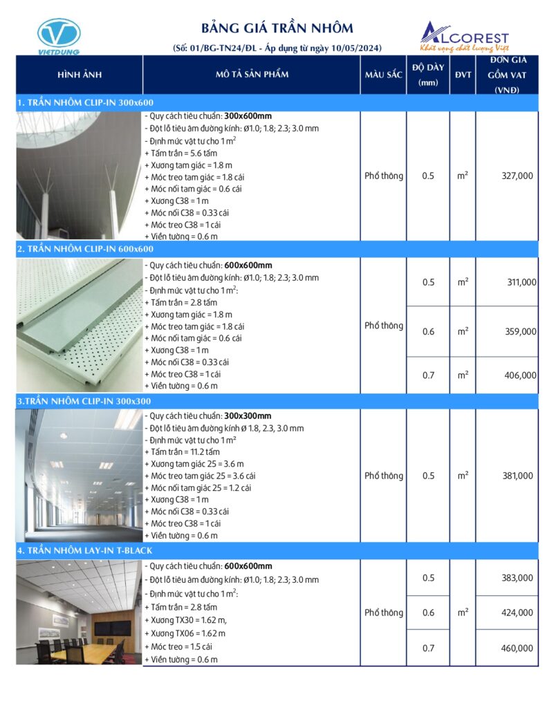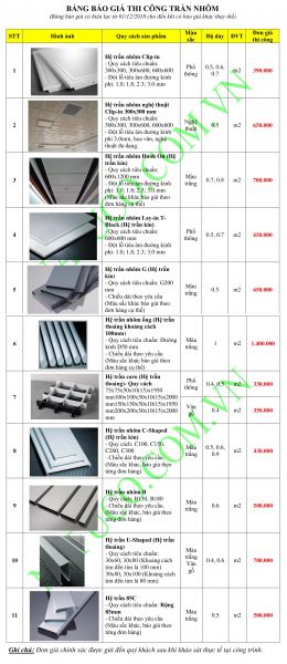 Khi bạn tra cứu bảng báo giá, hãy nhớ rằng đây chỉ là chi phí vật tư, chưa bao gồm nhân công lắp đặt. Với sự đa dạng về chủng loại và giá cả như vậy, việc chọn lựa trần nhôm phù hợp với không gian và ngân sách của bạn trở nên dễ dàng hơn bao giờ hết.