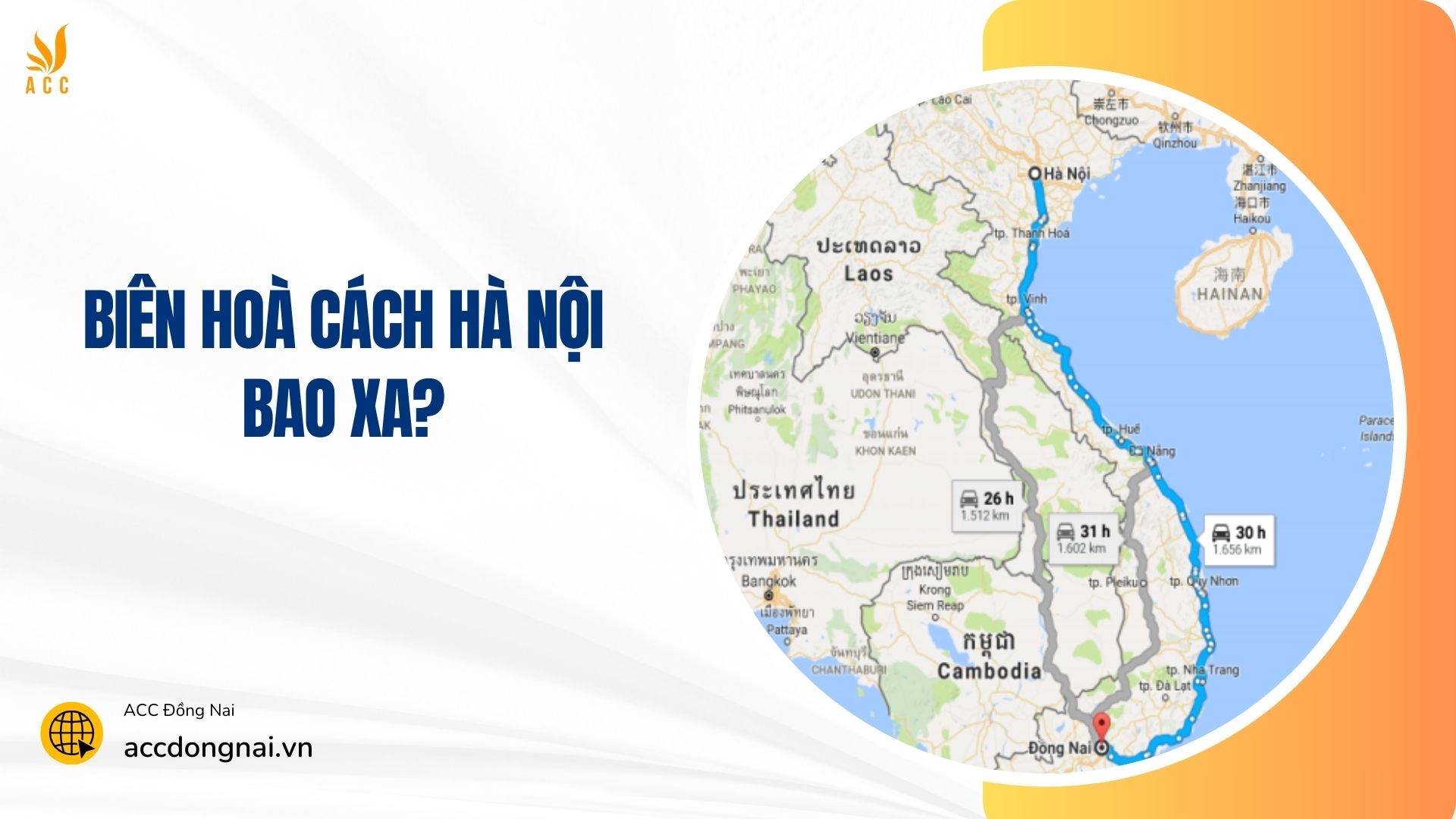 Biên Hòa, thành phố sôi động thuộc tỉnh Đồng Nai, cách Hà Nội khoảng 1.125 km theo đường chim bay. Điều này có nghĩa là nếu bạn có thể bay thẳng từ hai thành phố, quãng đường chỉ mất một thời gian ngắn. Tuy nhiên, thực tế thì quãng đường di chuyển bằng tàu hay xe lại dài hơn nhiều. Nếu bạn chọn đi tàu hỏa, hành trình sẽ kéo dài khoảng 33 tiếng, với tổng khoảng cách lên tới 1.697 km.