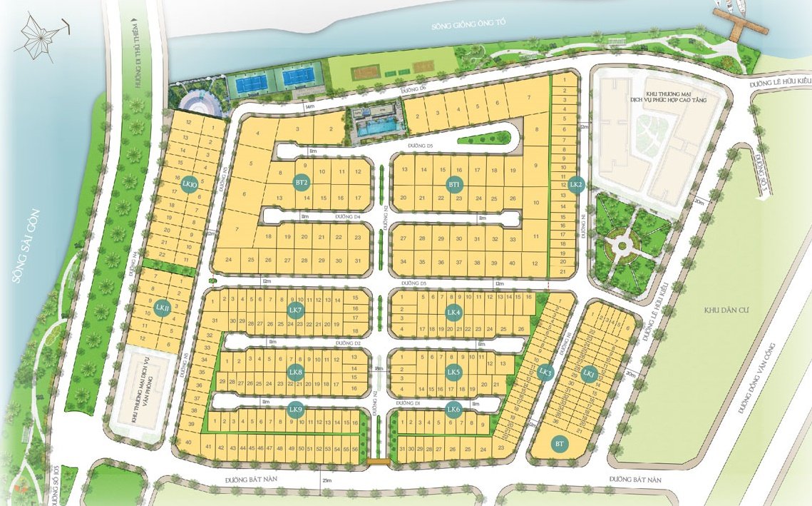 Điểm thu hút chính của dự án là vị trí đắc địa hai mặt giáp sông, nằm ngay tại trung tâm hành chính của Quận 2, gần khu đô thị mới Thủ Thiêm. Với diện tích toàn khu lên đến 14,59ha và mật độ xây dựng chỉ 40.64%, khu phức hợp này hứa hẹn mang đến không gian sống không chỉ chất lượng mà còn thoáng đãng.