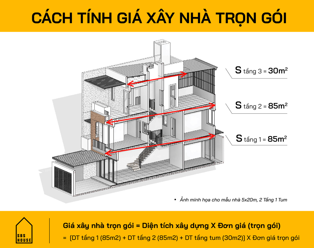 Khi dự toán chi phí xây dựng nhà, điều đầu tiên bạn cần làm là xác định diện tích xây dựng của ngôi nhà. Diện tích này sẽ được tính dựa trên tổng các hạng mục như móng, tầng trệt và các tầng khác. Để tính chi phí, bạn chỉ cần nhân diện tích với đơn giá xây dựng theo mét vuông.