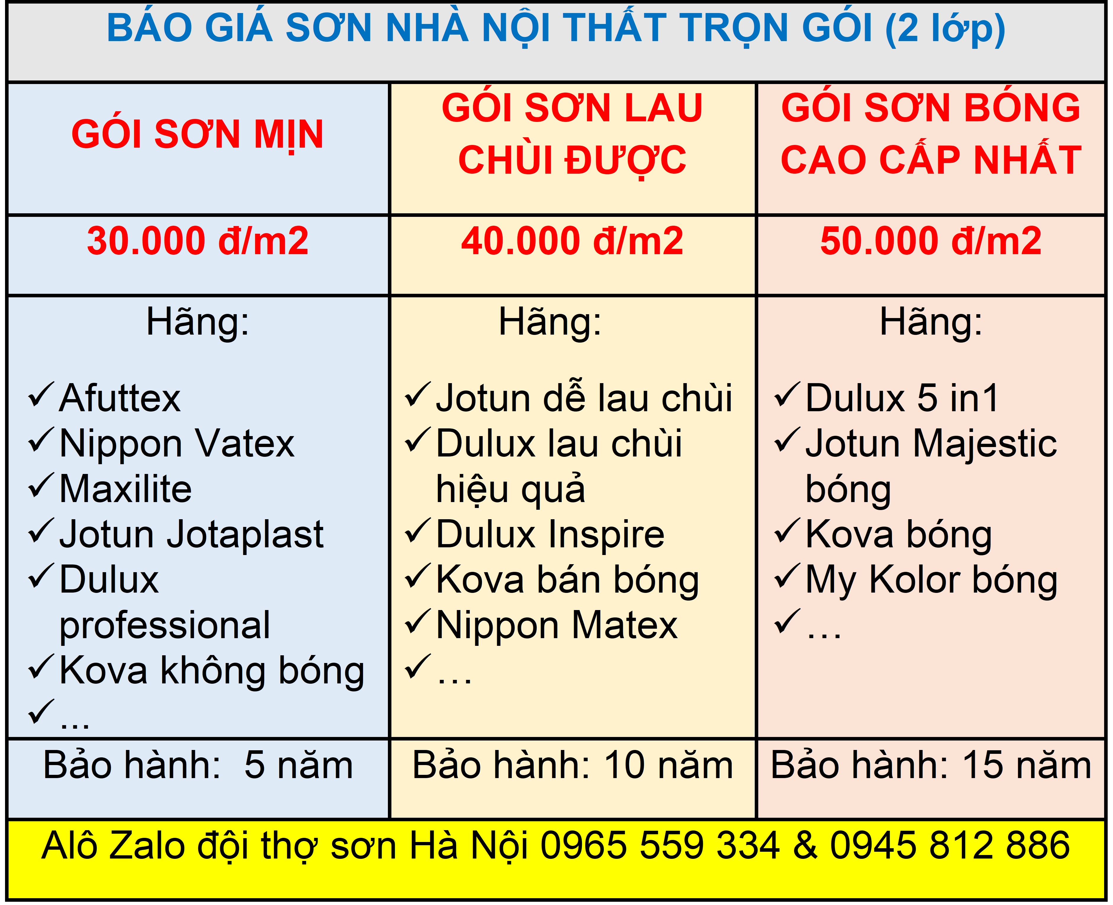 Ngoài ra, nếu bạn có nhu cầu sơn ngoại thất với chất lượng tốt như Dulux hay Jotun, thì mức giá cũng khá hợp lý, khoảng từ 180.000đ đến 245.000đ cho các gói sơn hoàn chỉnh bao gồm cả nhân công và vật tư. Với dịch vụ sơn nhà chuyên nghiệp, bạn sẽ dễ dàng tìm được giải pháp phù hợp với nhu cầu và ngân sách của mình.