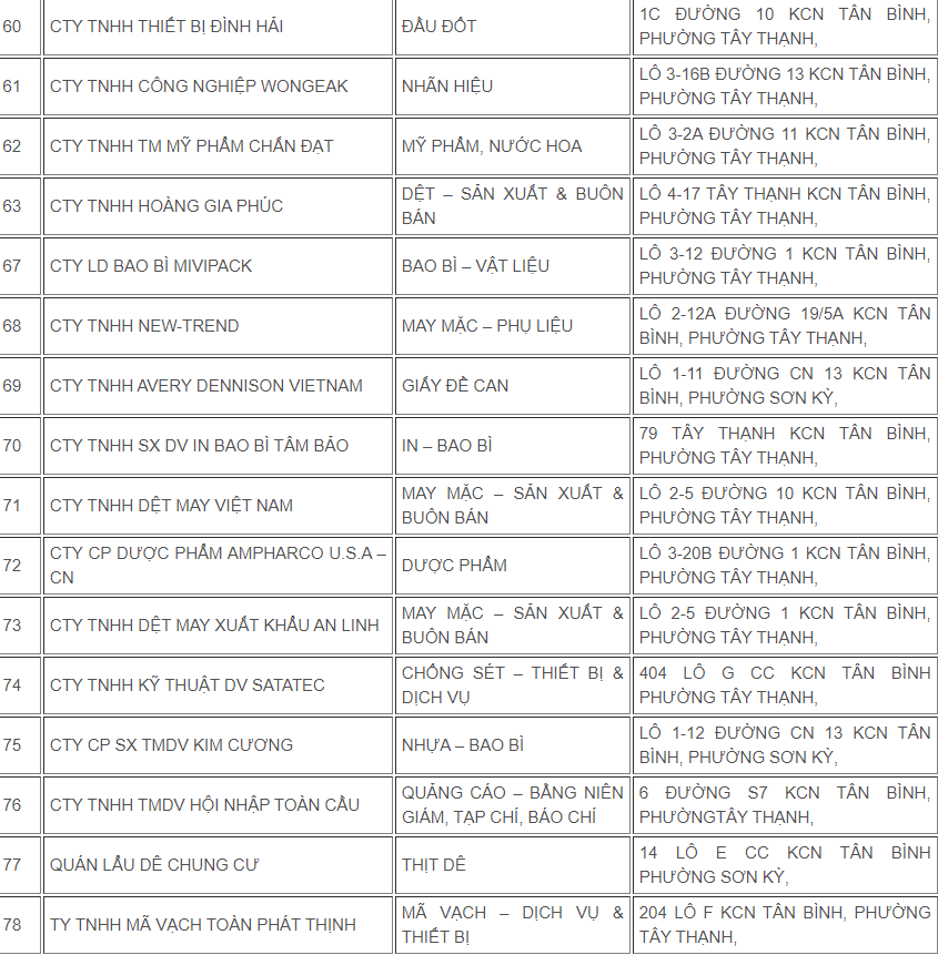 Ngoài ra, những công ty như CÔNG TY CỔ PHẦN BAO BÌ SÀI GÒN và CÔNG TY CỔ PHẦN CAPITAL SEAWEED cũng đang phát triển mạnh mẽ ở đây. Đặc biệt, KCN Tân Bình hiện có tới 198 doanh nghiệp, trong đó có 68 doanh nghiệp FDI.