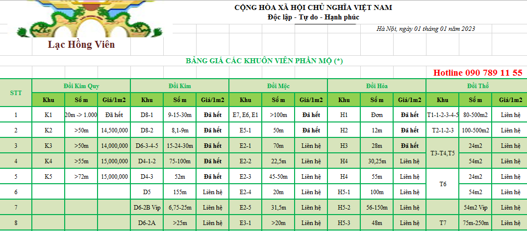 Nếu bạn có nhu cầu tìm hiểu cụ thể hơn về bảng giá tại Lạc Hồng Viên, hãy liên hệ theo hotline để được tư vấn chi tiết. Với vị trí đẹp và phong thủy tốt, Lạc Hồng Viên không chỉ là nơi an nghỉ mà còn mang lại sự bình yên cho cả gia đình.