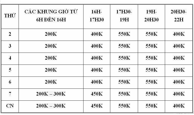 Thông thường, từ thứ Hai đến thứ Sáu, giá thuê sân trong khoảng từ 100.000 đến 150.000 VNĐ cho các khung giờ khác nhau. Vào cuối tuần, giá cao hơn một chút, từ 120.000 đến 170.000 VNĐ. Đặc biệt, vào khung giờ cao điểm từ 7h đến 17h, mức giá có thể lên đến 350.000 VNĐ/giờ, và sau 17h, giá sẽ là 400.000 VNĐ và 450.000 VNĐ cho các ngày cuối tuần.
