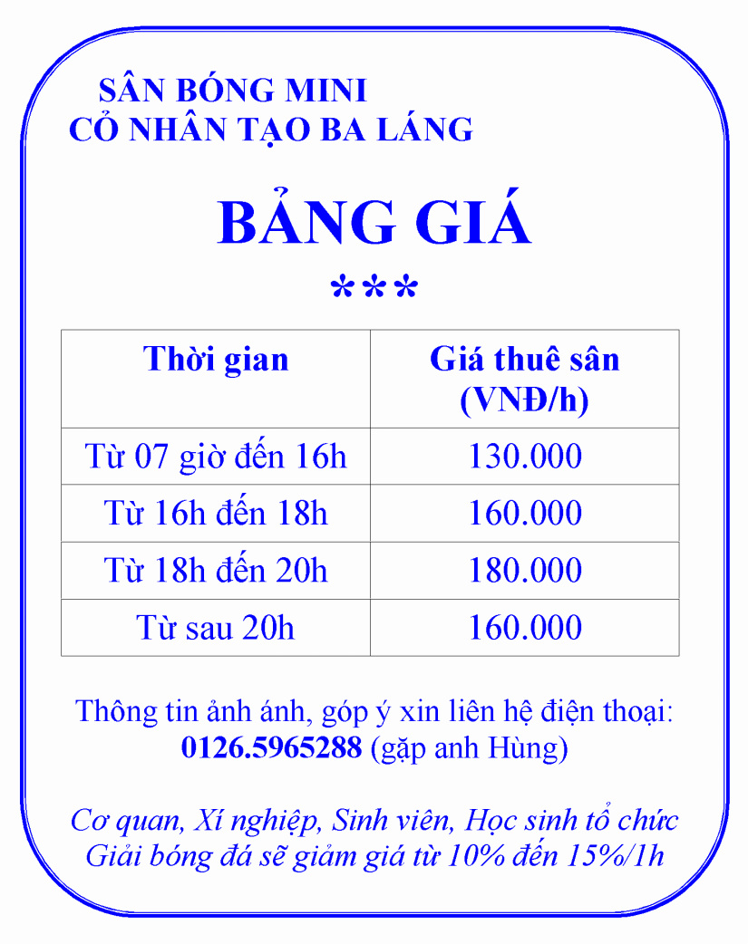 Tuy nhiên, còn có sân cỏ nhân tạo cao cấp, đạt tiêu chuẩn FIFA, với giá thuê cao hơn. Ví dụ, trong khung giờ từ 7h đến 17h, giá thuê là khoảng 350.000 VNĐ/giờ, và nếu bạn chơi sau 17h, mức giá sẽ tăng lên tới 400.000 VNĐ/giờ. Vào cuối tuần, giá cũng có phần nhẹ nhàng hơn, dao động từ 250.000 VNĐ đến 600.000 VNĐ tùy theo khung giờ.