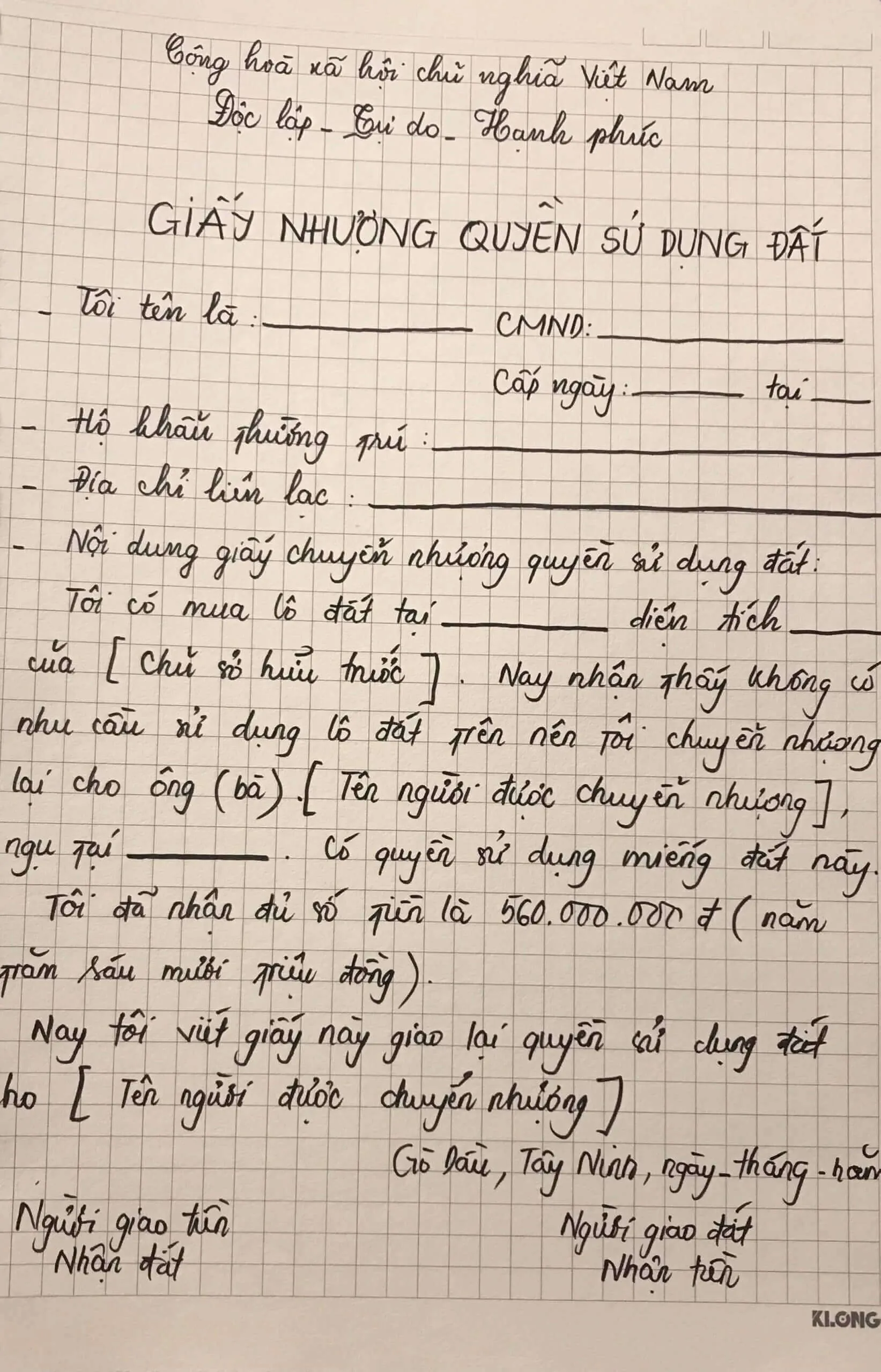 Giấy chuyển nhượng đất viết tay là một hình thức phổ biến ở Việt Nam, thường được sử dụng trong các giao dịch mua bán đất. Điều đặc biệt ở đây là hợp đồng chuyển nhượng này không được công chứng hoặc chứng thực, mà chỉ được soạn thảo bởi các bên mua và bán. Chính vì vậy, nó thường kèm theo những rủi ro nhất định.