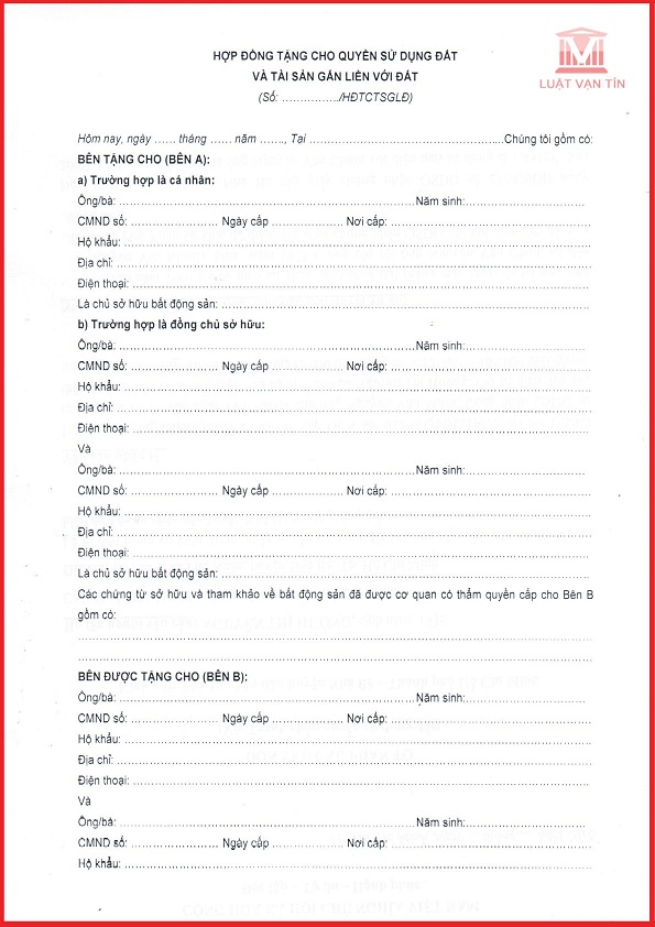 Khi có ý định tặng cho nhau nhà đất, việc lập hợp đồng tặng cho là rất quan trọng. Một hợp đồng tặng cho phải được lập thành văn bản và có công chứng, chứng thực để đảm bảo tính pháp lý. Điều này không chỉ giúp bảo vệ quyền lợi của cả hai bên mà còn tránh được những tranh chấp có thể xảy ra sau này. Mẫu hợp đồng này cần có đầy đủ thông tin về những bên tham gia, cụ thể là bên tặng cho (Bên A) và bên được tặng cho (Bên B).