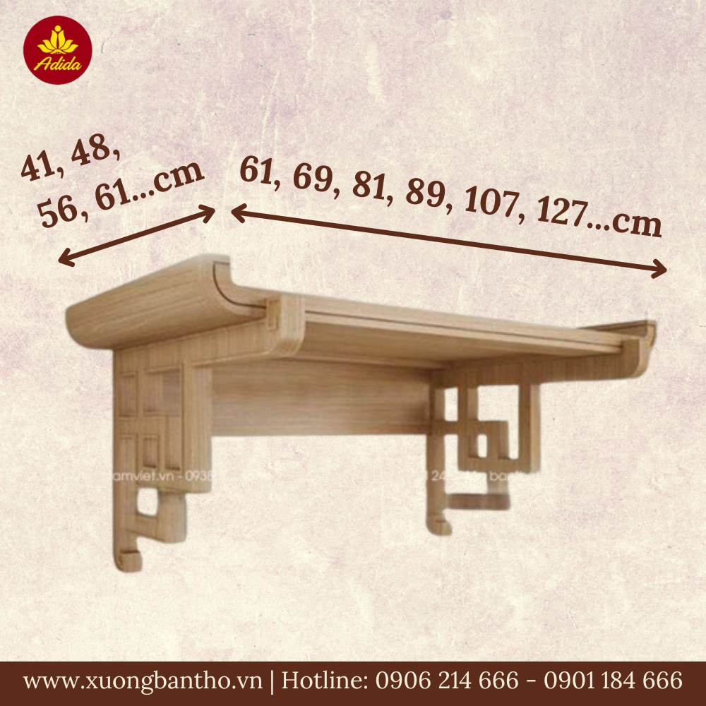 Ngoài ra, bàn thờ treo còn có nhiều kích thước khác, như 41cm x 61cm cho không gian siêu nhỏ hoặc 61cm x 107cm cho những phòng thờ rộng rãi hơn. Các kích thước đa dạng giúp bạn dễ dàng tìm được sản phẩm phù hợp theo nhu cầu và hoàn cảnh gia đình mình. Đồng thời, bàn thờ treo cũng giúp tối ưu hóa không gian, mang lại sự thoải mái và hài hòa cho ngôi nhà.