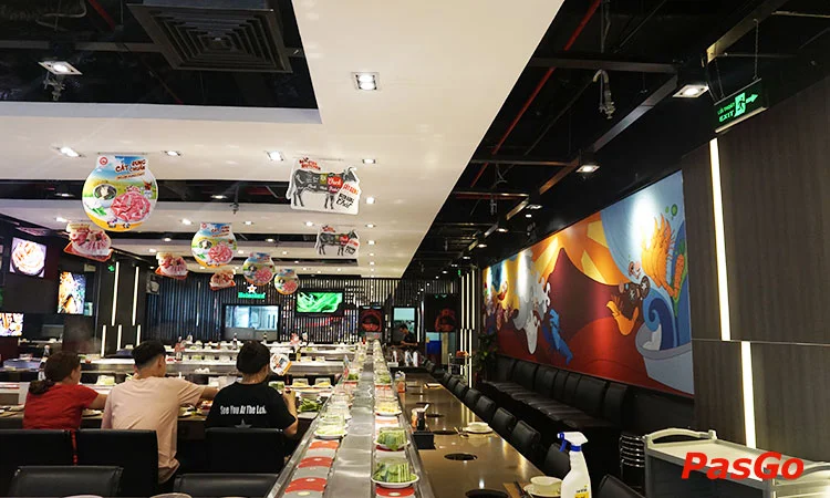 Không gian nhà hàng hiện đại, rộng rãi, phù hợp cho cả nhóm bạn và gia đình. Nếu đi đông người, bạn còn được xếp chỗ ngồi bàn gia đình để vừa ăn vừa trò chuyện thoải mái. Ngoài ra, khách ngồi bàn gia đình có thể yêu cầu nhân viên mang món ăn mình thích ra tận bàn mà không cần lấy trên băng chuyền.
