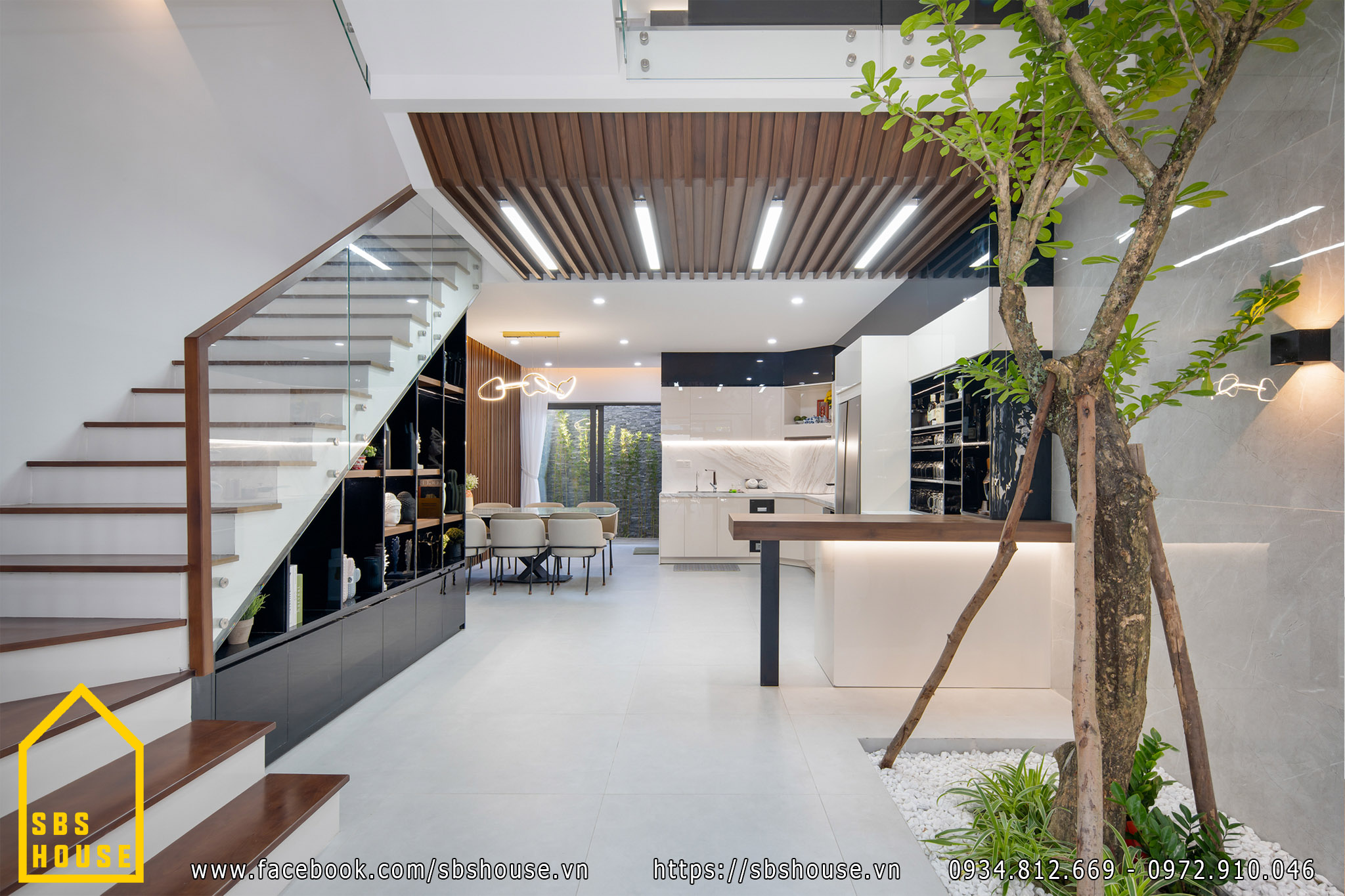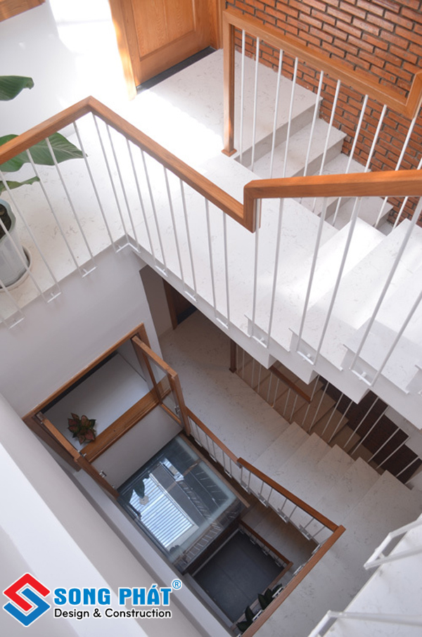 Ngoài ra, việc thiết kế các tiểu cảnh xanh mát quanh giếng trời cũng là một điểm nhấn thú vị, vừa giúp không gian sống trở nên sinh động, vừa hỗ trợ ánh sáng trong nhà. Với những điểm kết hợp này, cầu thang không chỉ là lối đi mà còn là một phần không thể thiếu trong không gian sống, mang lại năng lượng tích cực cho gia đình.