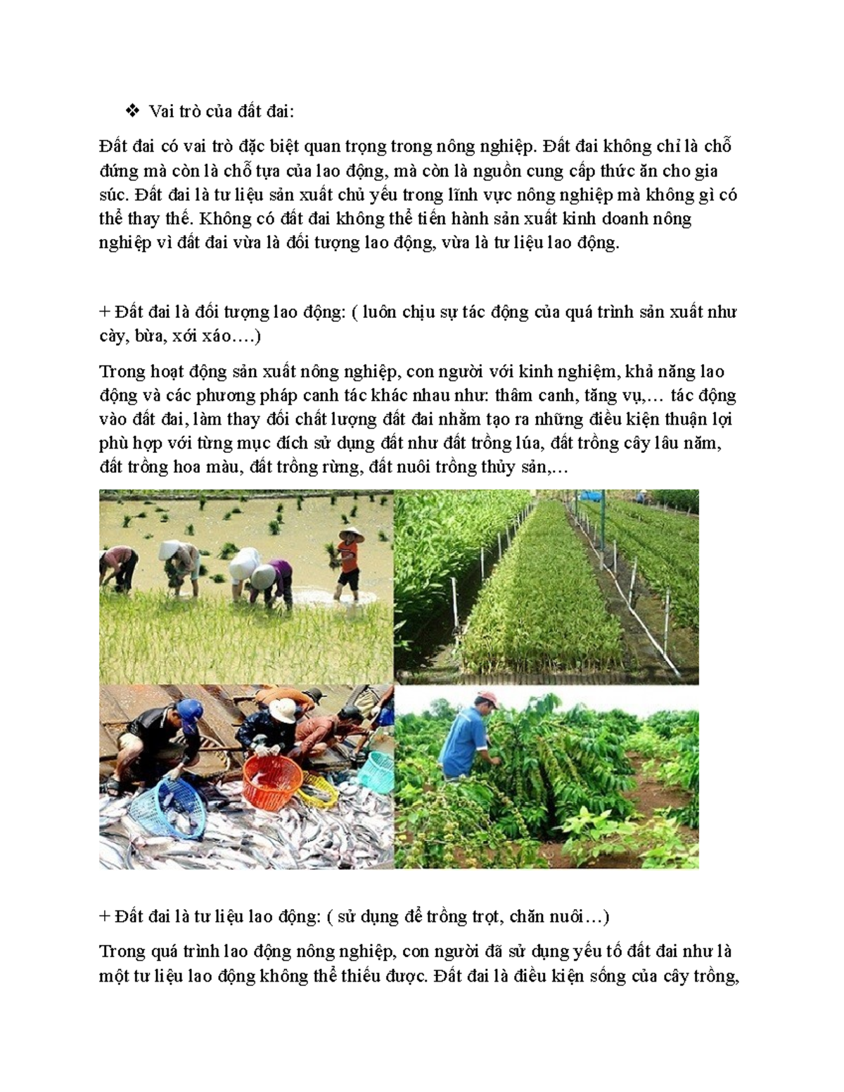 Đất giữ vai trò vô cùng quan trọng trong sản xuất nông nghiệp, không chỉ là nơi để cây trồng bám rễ mà còn là nguồn cung cấp dinh dưỡng thiết yếu giúp cây phát triển khỏe mạnh. Đất là tư liệu sản xuất chủ yếu mà không thứ gì có thể thay thế được, bởi nó vừa là đối tượng lao động – chịu tác động của các hoạt động như cày, bừa, xới đất – vừa là tư liệu lao động để trồng trọt và chăn nuôi.